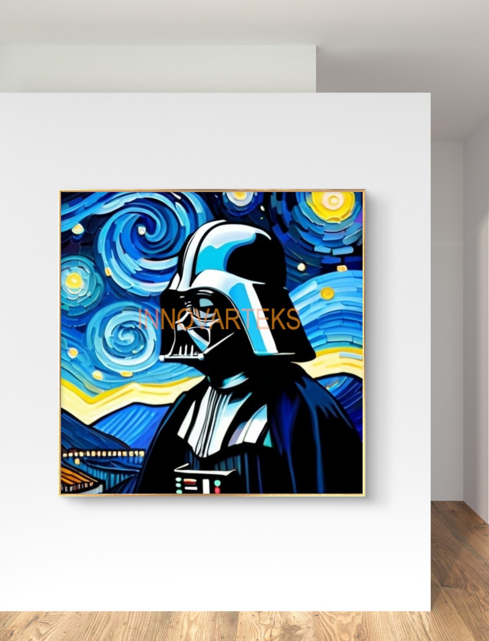 Abrace la convergencia cósmica donde la eterna obra maestra de Van Gogh, ‘La noche estrellada’, se entrelaza con la presencia icónica de Darth Vader del universo de Star Wars. Esta cautivadora pintura realizada en la técnica de impresión Giclée sobre lienzo belga profesional de alta calidad, 100% algodón, utilizando una variedad de sofisticados programas y técnicas para crear obras de arte originales, incluida la IA, nació de las profundidades de la imaginación y el arte, narra una Saga de intriga celestial y atractivo oscuro. Sea testigo de las galaxias arremolinadas de las pinceladas de Van Gogh fusionándose a la perfección con la siniestra silueta de Vader, proyectando un brillo etéreo sobre el lienzo. Cada trazo cuenta una historia de misterio intergaláctico, donde las estrellas luminosas susurran secretos del cosmos y la enigmática figura de Vader llama la atención en medio de la danza celestial.